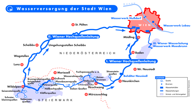 Zwei Hochquellwasserleitungen versorgen die Stadt Wien mit Wasser. Über Wasserleitungsbrücken kommt das Wasser zu den Wasserspeichern in Wien. Das Wasser wird untersucht und an die Haushalte weitergeleitet. Von der Quelle bis zum Wasserhahn einer Wiener Wohnung benötigt das Wasser ungefähr einen Tag.